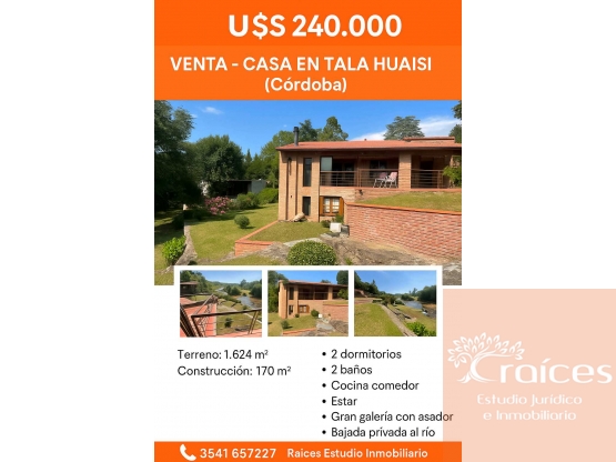 🏡 VENTA – CASA EN TALA HUASI (Córdoba)📐 Terreno: 1.624 m²🏗 Construcción: 170 m²✨ Características:2 dormitorios2 bañosCocina comedorEstarGran galería con asadorBajada privada al río💰 Valor: U$S 240.000📲 Consultas: 3541 657227