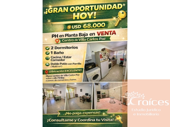 🏡 Departamento PH en venta – Planta Baja – Centro de Villa Carlos Paz (Calle Finlay)