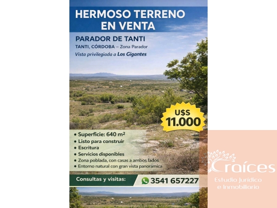 HERMOSO TERRENO EN VENTA – PARADOR DE TANTI Tanti – Zona Parador Vista privilegiada a Los Gigantes Excelente oportunidad para invertir o vivir en un entorno natural y tranquilo. Características: Superficie: 640 m² Listo para construir Escritura Servicios disponibles Zona poblada, con casas a ambos lados Entorno natural con gran vista panorámica Ideal para: Vivienda permanente Casa de descanso Complejo turístico / cabañas Consultas y visitas: